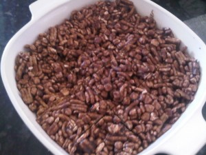 Cole says to cut into 6 pieces, which to me are absolutely huge, so I figure cut em in half, then they’re only 75 calories, right? But, after eating them, I know I would probably prefer them more with vanilla protein, and more marshmallows so they stick together better. 2/3 a cup of marshmallows is 100 calories and no fat. That brings each piece to 83 calories.. I have to talk to cole and see if these are good changes to make, but overall, they’re awesome!